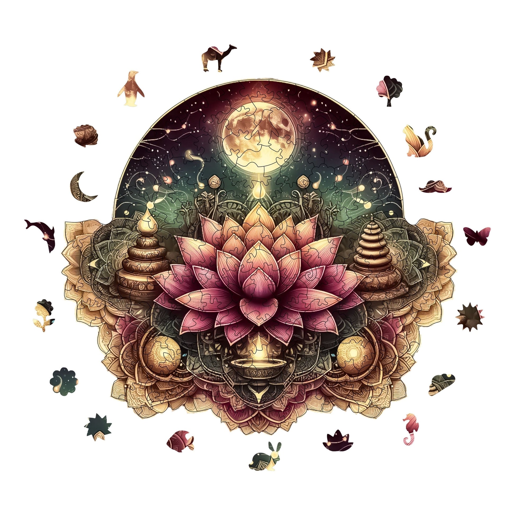 - Özel Tasarım ve Tema: Bu ahşap yapboz, Yıldızlı Lotus Mandala temasına sahiptir ve detaylı çizimi ve kendine özgü tasarımıyla klasik karton yapbozlardan açıkça ayrılır.