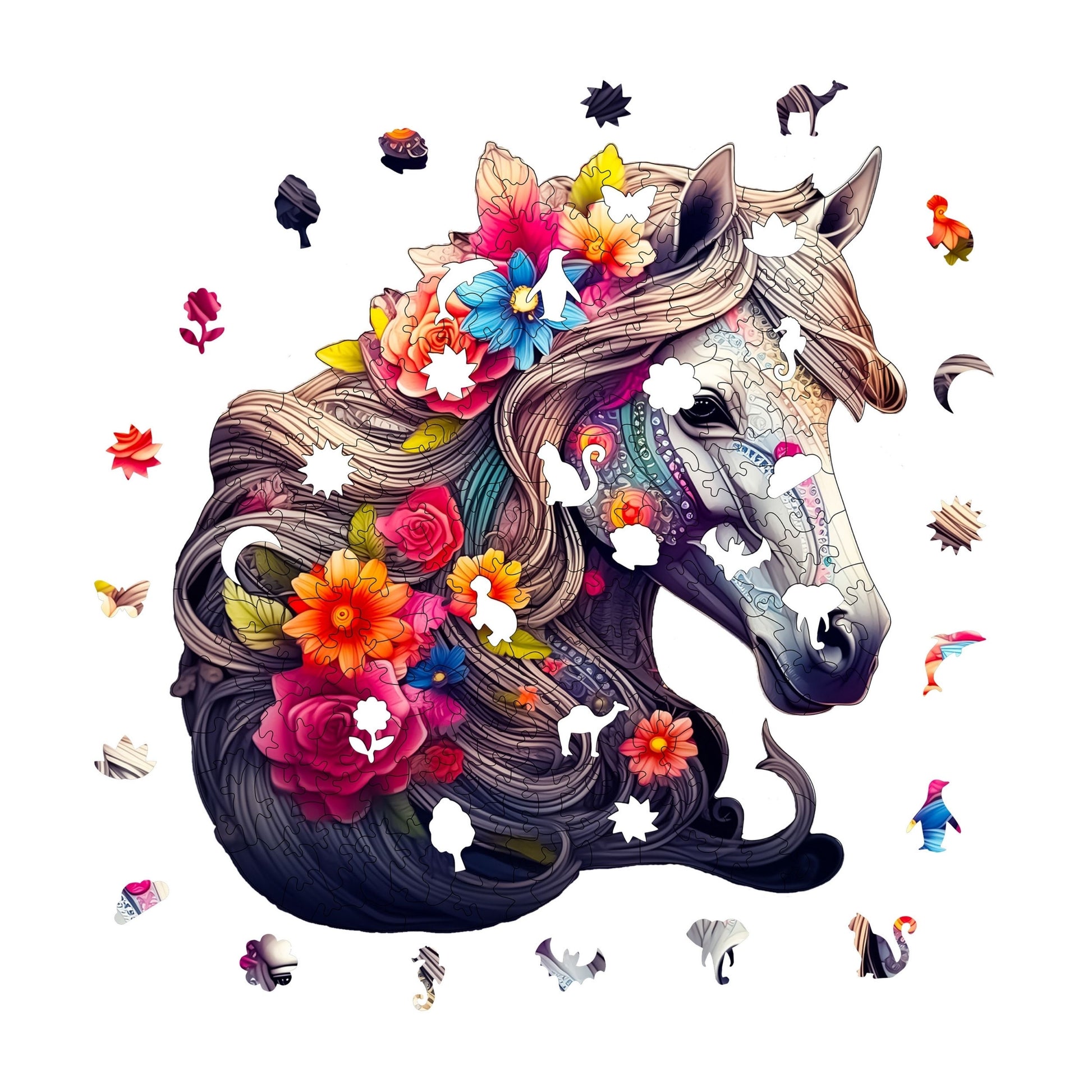 Çiçek Yeleli At Figürü - Ahşap Puzzle