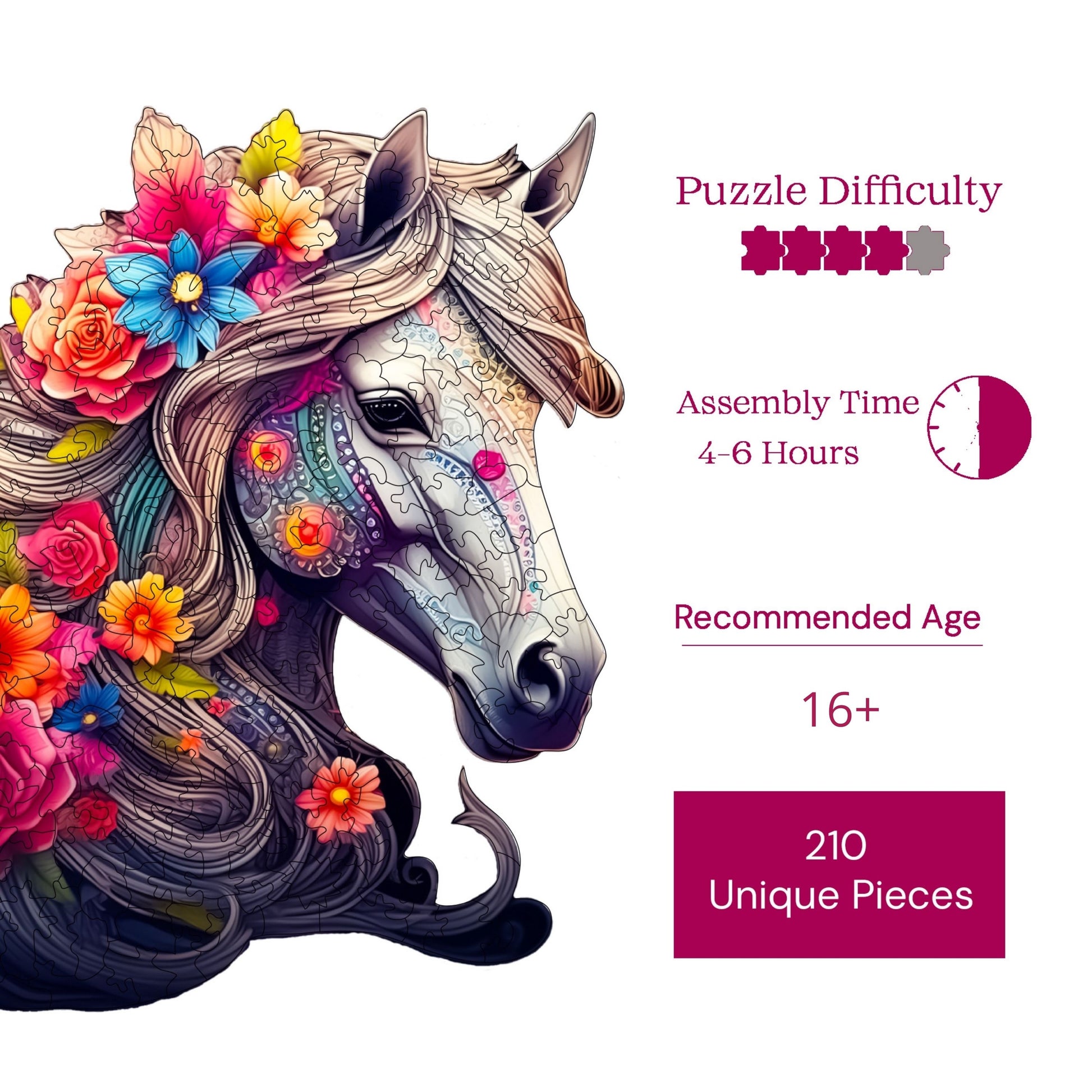 Yetişkinler İçin Ahşap Yapboz – Çiçek Yeleli At Figürü | WZ-09 | 210 Parça | 27 × 29 cm (10,6” × 11,4” inç)