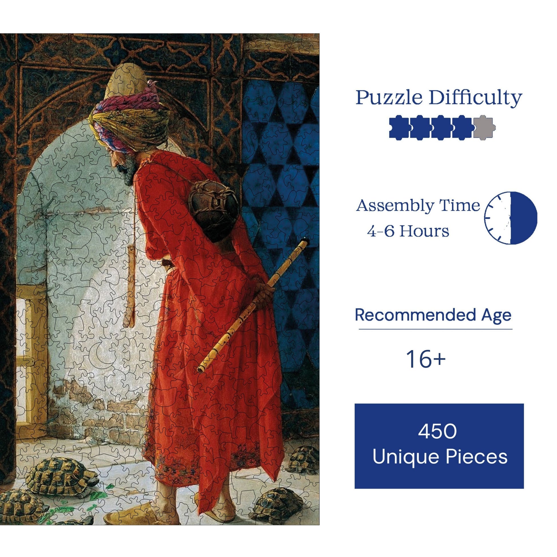 - Özel Tasarım ve Tema: Bu ahşap yapboz, Kaplumbağa Terbiyecisi temasına sahiptir ve detaylı çizimleri ve kendine özgü tasarımıyla klasik karton yapbozlardan açıkça ayrılır.