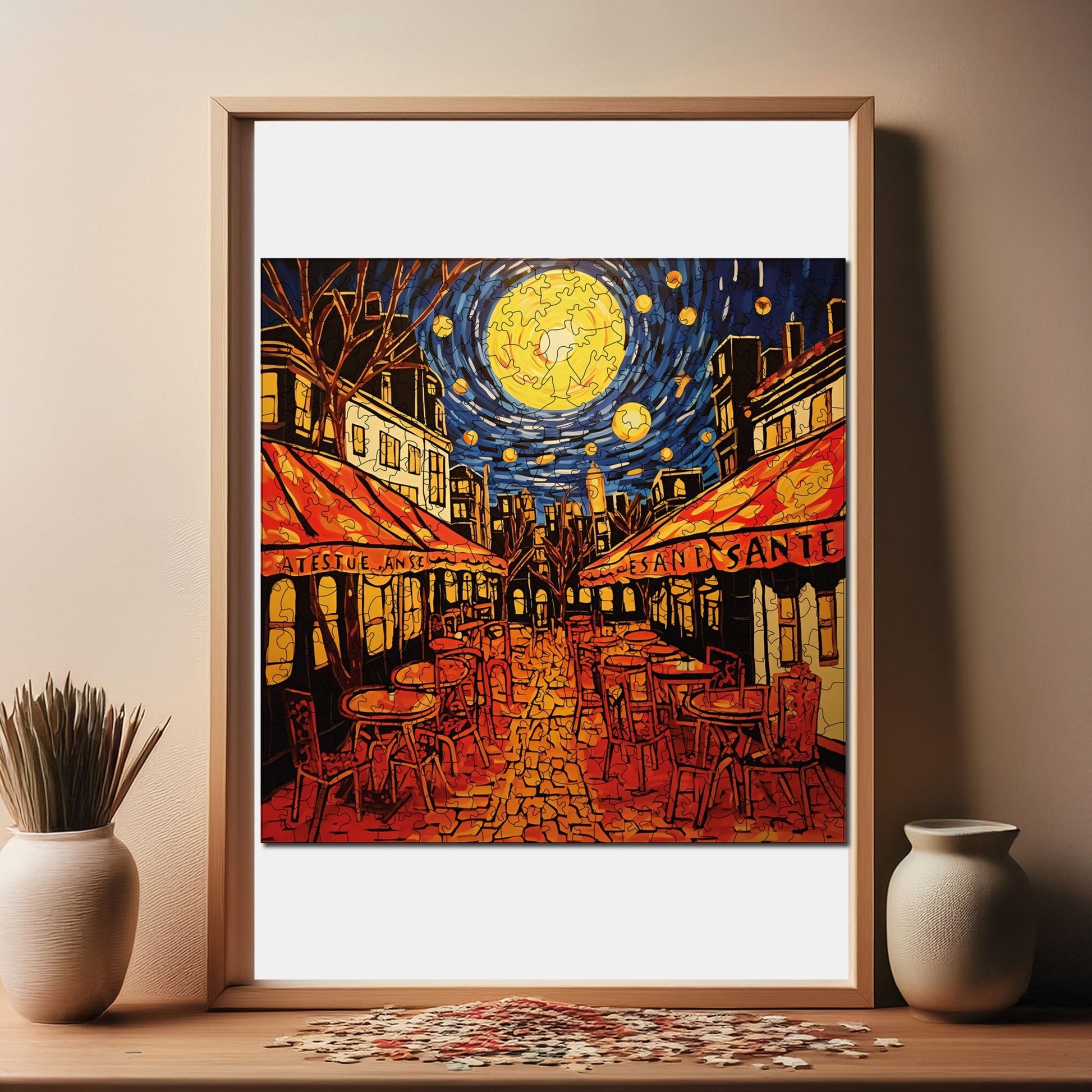 - Özel Tasarım ve Tema: Bu ahşap yapboz, Van Gogh'un "Kafe Terası Gecesi" tablosunun bir reprodüksiyonu temasına sahiptir ve detaylı çizimi ve kendine özgü tasarımıyla klasik karton yapbozlardan açıkça ayrılır.