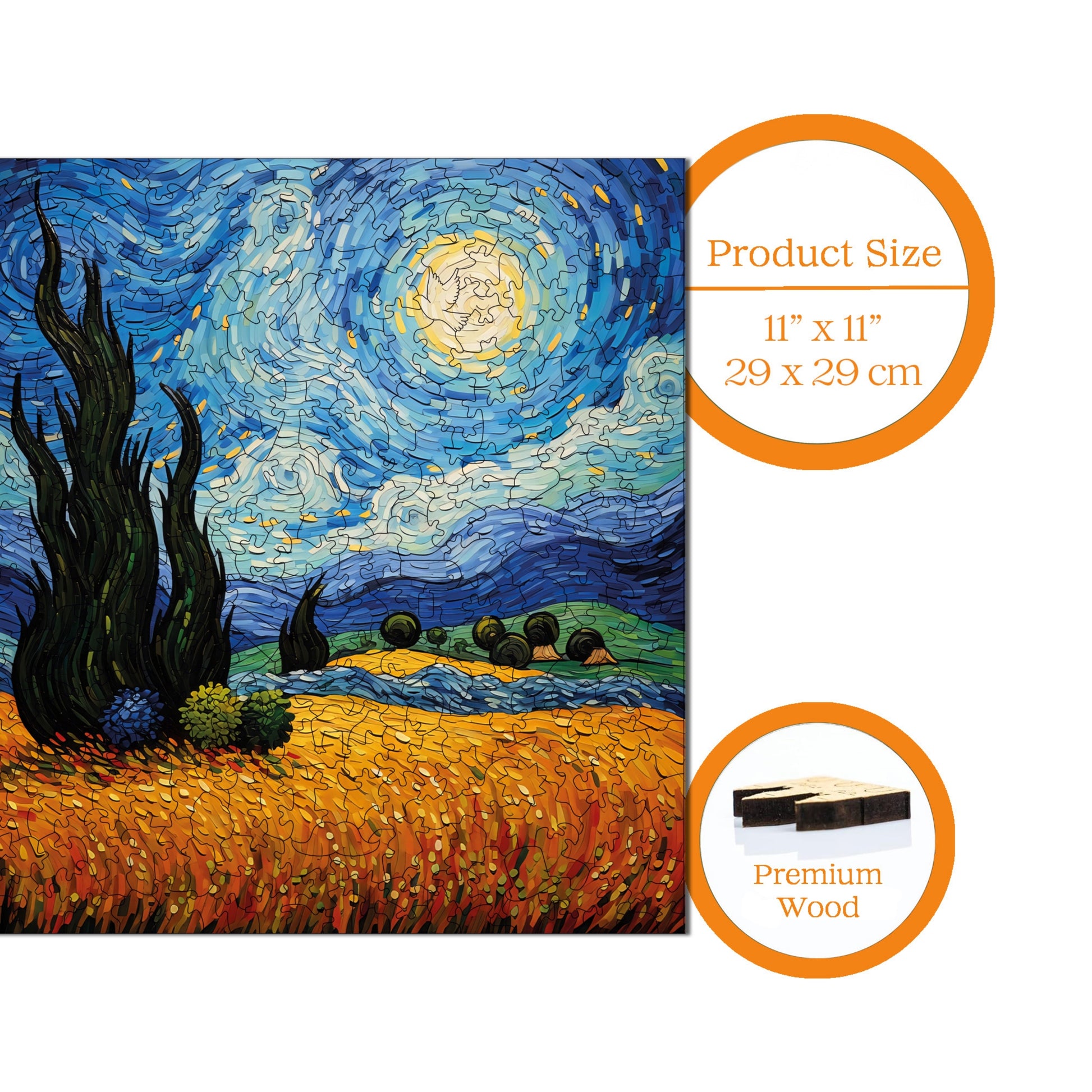 Yetişkinler için Ahşap Yapboz – Van Gogh “Yıldızlı Gece” Reprodüksiyonu | S1-35 | 353 Parça | 29 × 29 cm (11,4” × 11,4” inç)