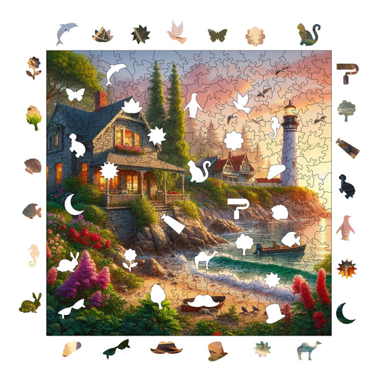 Yetişkinler İçin Ahşap Puzzle, Deniz Feneri ve Taş Ev Premium Puzzle, 353 Parça Zorlu Ahşap Yapboz, 11,4"x11,4" (29x29 cm) Benzersiz Şekil, Yetişkinler İçin Ahşap Yapbozlar